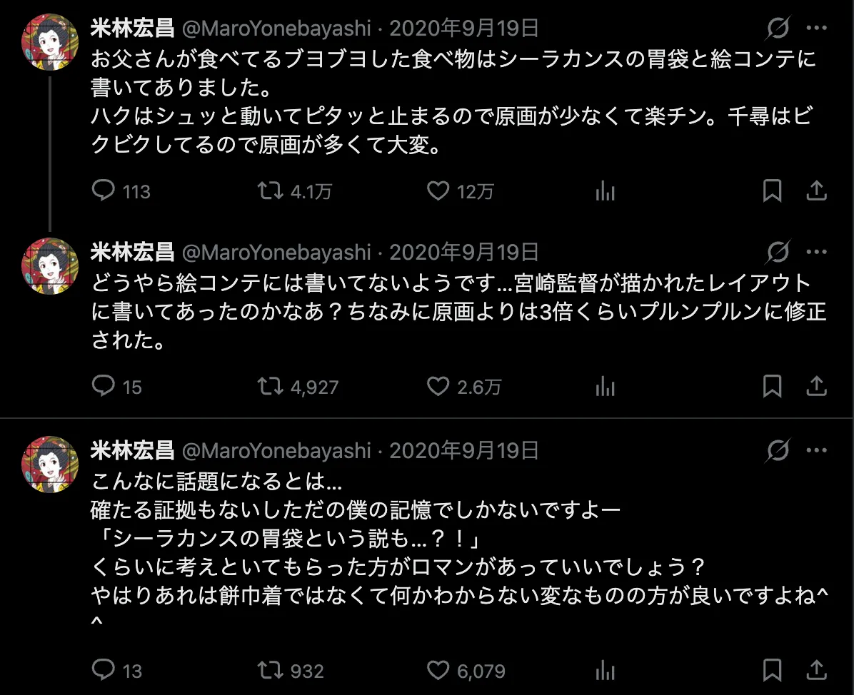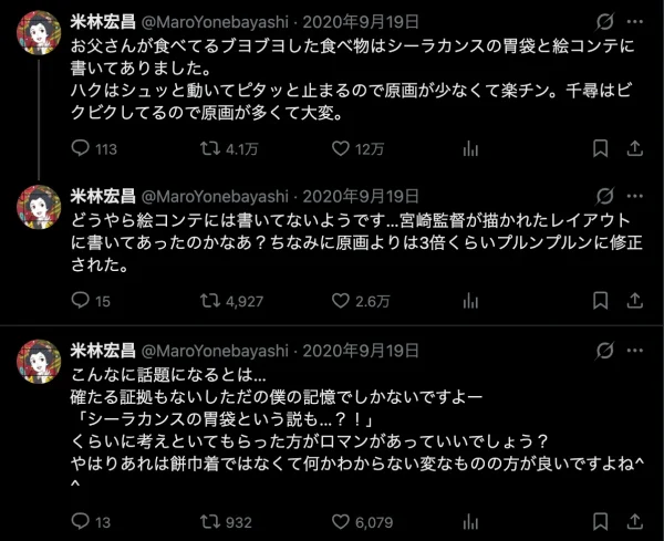 その米林さんが、2020年にスタジオジブリの作品のスクリーンショットが一挙に無料提供されたのに合わせて、2020年9月19日に自身のTwitter(現X)アカウントで、食事シーンの原画を自分が手がけことをツイートしていました。