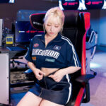 ビキニ姿でゲーミングチェアに腰掛けるカットは、思わず視線を吸い寄せられる瞬間である。ヘッドセットを纏った姿が新鮮さを添え、ゲームの世界とセクシーな存在感が絶妙に交わっている。