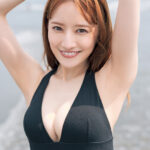 黒のワンピース水着を着て大胆に脇を見せるカットは、爽やかな笑顔と艶やかな色香が同居する一枚である。