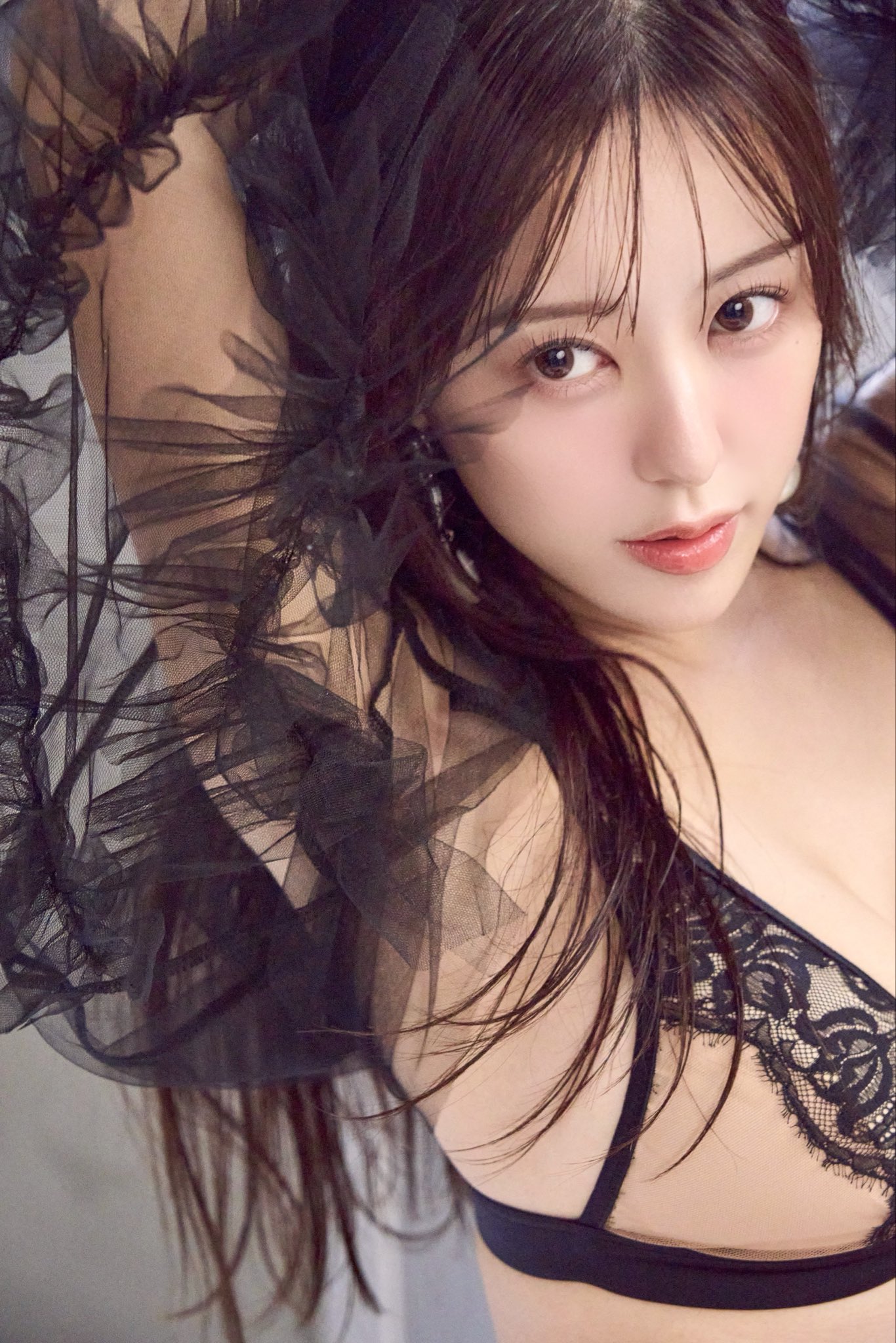黒のレースランジェリーに身を包み、透け感のあるチュール袖をふわりと広げたカットは、視線を奪わずにはいられない。艶やかさの中に、どこか可憐な雰囲気を感じさせるその姿は、まさに心のツボをついてくる。