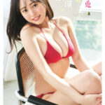 巻頭グラビアでは、ワインレッドのニットワンピに身を包んで微笑む姿や、淡いブルーのチューブトップ水着で大人っぽい表情をのぞかせる姿、シックなブラックの水着で横たわる姿などが見られる。