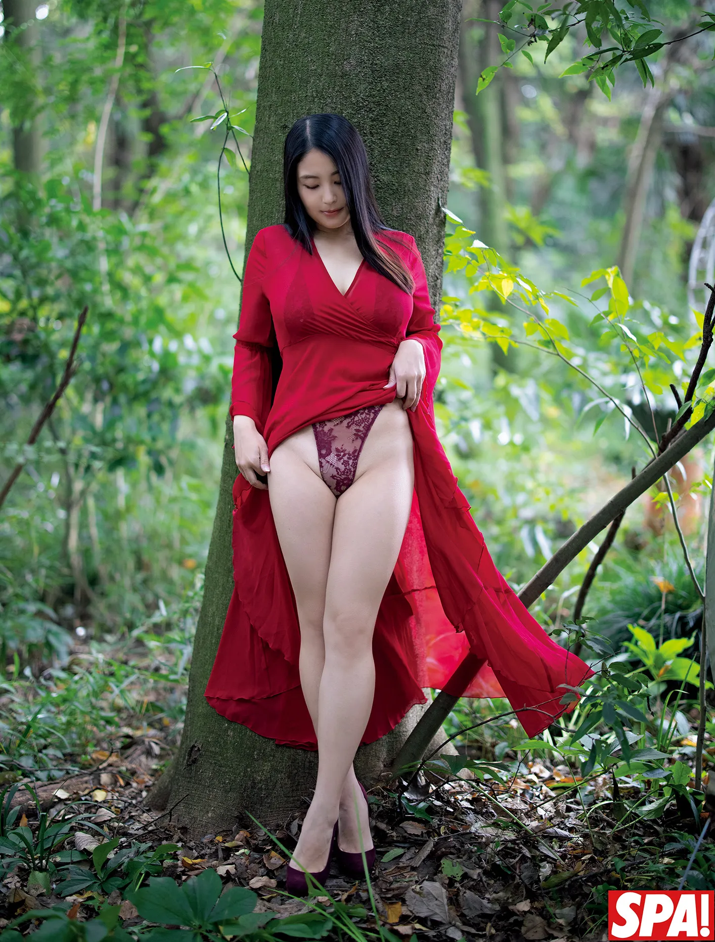 鋭角な下着のラインが際立つカットは、深い赤のワンピースが揺れるたびに視線を引き寄せ、自然の緑の中でひときわ鮮烈な存在感を放っている。