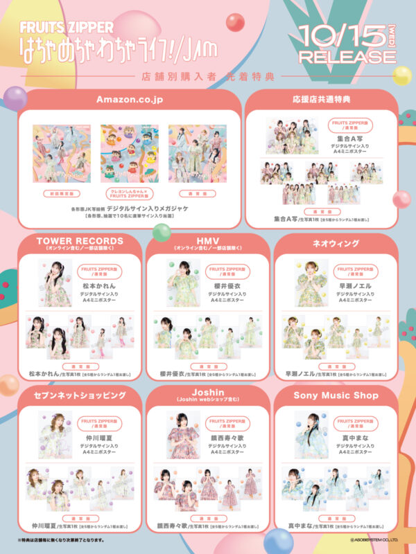 また、本日対象店舗にてシングルCDを予約・購入すると付いてくる店舗別CD購入特典の絵柄も解禁された。現在FRUITS ZIPPERは全国でCDリリースイベントを開催中だ。詳しい情報は公式Webサイトをチェックしてほしい。