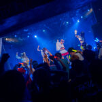 「いよー!!」の声を合図に、最後に4人は「そいや!!そいや!!」「拳を突き上げ!!」と囃したてながら、Re:Yu流のラウドなお囃子ナンバー『午前零時のトリカブト』を華やかにぶちかました。彼女たちが「拳 拳 拳上げたい」と煽るたびに、この場に拳の花が咲き誇る。いつしかフロアでは大きなサークルが生まれ、みんなで顔を見合わせて祭りあがっていた。後半には、観客たちが両隣の人たちと肩を組んでヘドバンをする場面も誕生。華やかで派手派手しい、まさに絢爛で華美な。いや、絢爛で騒乱な様がRe:Yuのライブらしい。本当に、最高に華やかな宴が最後に生まれていた。