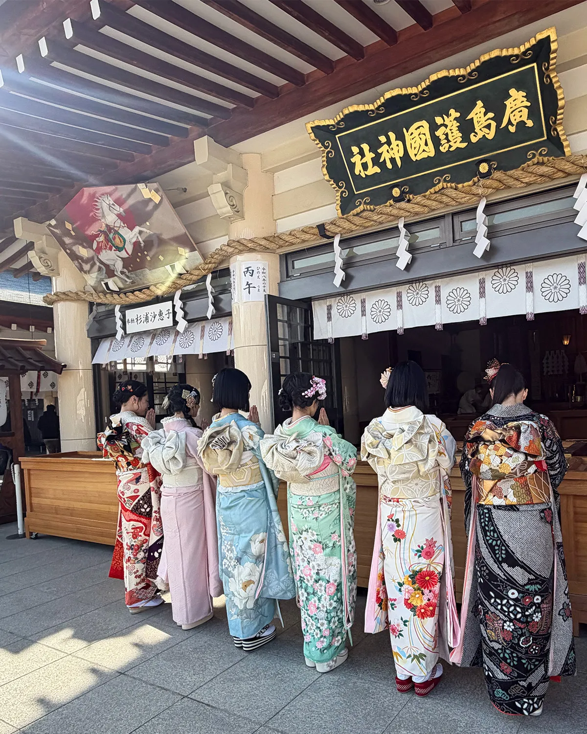 それぞれが自身で選んだ華やかな振袖をまとい、凛とした姿で神殿へと入った。20歳という節目を迎えた自覚と喜びに満ちた表情により、会場は厳かでありながらも華やかな空気に包まれた。